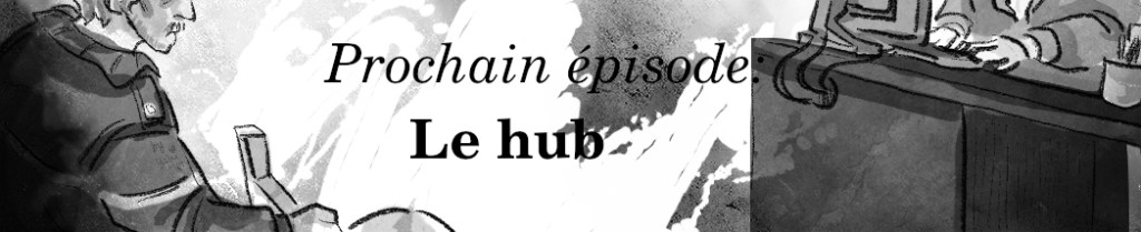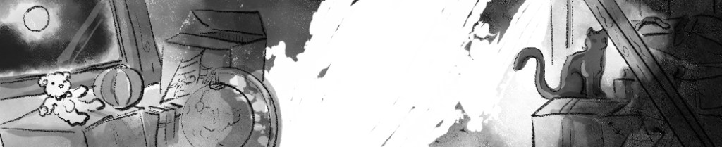 un coffre avec un couvercle bombé trônait sous la chatière voilée par les toiles d’araignées, il avait été tiré sur un chemin de côte par Billy Bones en personne après son naufrage, une étagère sur pieds qui montait jusqu’aux poutres, elle ne portait que des livres de formats divers, mais pas d’albums, une penderie, c’était une simple barre avec des cintres, une veste à boutons dorés sur le devant et un symbole cousu dessus : des petites ailes, il y pendait quelques autres habits, des robes ; il y avait une petite table, non ce n’était pas une table, le plan de travail était en pente douce, il y avait un trou pour un encrier, le pupitre simple était disposé à peu près sous la lucarne et siégeait devant une petite chaise de cuisine avec des pieds ronds. Une montgolfière miniature se balançait légèrement, elle hébergeait une ampoule électrique de jadis, en forme de poire. Il se baissa et ouvrit le coffre: il y avait des cahiers d’école, ça y ressemblait en tous cas, des carnets, une Pipi Langstrump en chiffons avec de grandes tresses rousses, à l’intérieur du couvercle étaient collées des photos apparemment découpées, on y voyait Gérard Philippe revêtu d’une cotte de mailles, des murailles en arrière plan, il y avait Nicolas et Pimprenelle, Nounours aussi, des loups en meute courant dans la neige. Il se releva, regarda vers les étagères avec les livres cachés dans le coin obscure, le clair de lune n’y parvenait pas. Il se tourna vers le pupitre et ouvrit le plan de travail, il y vit une pile de cahiers A4, usés comme ceux que l’on oublie, enfant, au fond du cartable.
